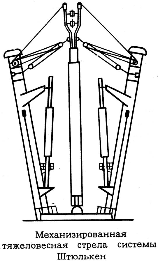 В отличие от легких тяжеловесные стрелы опираются своей шпорой не на мачту, а на специальный фундамент. Работают тяжеловесные стрелы либо поодиночке, но с переменным вылетом, либо вместе с патентованными конструкциями с двойным топенантом. Обычно работает на оба борта, обслуживая при этом только тот трюм, над которым установлена.