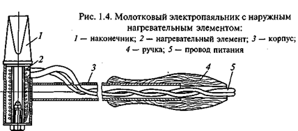 Для пайки кабельных наконечников различных типов и сечений с монтажными проводами, а также крупных электрорадиоэлементов с массивными выводами применяются электропаяльники с наружными нагревательными элементами (рис. 1.4) мощностью 90... 120 Вт. Температура разогрева торца паяльного наконечника таких паяльников может достигать 400 °С.