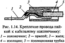 Крепление жилы провода к кабельному наконечнику пайкой производится следующим образом. Жилу монтажного провода после разделки и облуживания вставляют внутрь кабельного наконечника, слегка обжимают его и пропаивают (рис. 1.14). Припой должен спаять токопроводящую жилу провода с внутренней поверхностью наконечника.