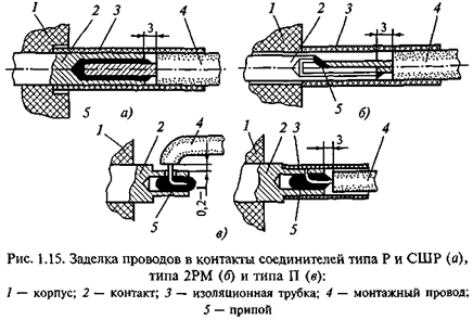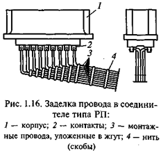 Заделка проводов в контакты соединителей типов Р, СШР, 2РМ и П показана на рис. 1.15, а типа РП — на рис. 1.16. Провода, заделываемые в соединители ГРМ, рекомендуется крепить непосредственно у их корпусов.
