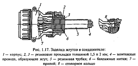 Заземление экранов проводов должно производиться на свободный контакт соеди нителя. При испытании и эксплуатации во избежание отрыва проводов, а также повреждения или смещения изоляции категорически запрещаетсяразъединять соединители приложением усилий к жгутам. Заделка жгутов в соединителе приведена на рис. 1.17. Натяжение проводов около мест пайки не допускается.
