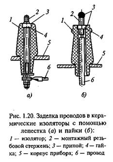 Заделка провода к выводу на стеклянном изоляторе показана на рис. 1.19, а заделка проводов в керамические изоляторы — на рис. 1.20.