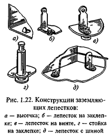 Монтаж радиоэлектронной аппаратуры и приборов производится экранированными проводами в тех случаях, когда провода (электрические цепи) подвержены воздействию помех или сами создают их. Экранирующие оплетки монтажных проводов необходимо заземлять, для чего используются заземляющие лепестки различных конструкций (рис. 1.22), выполненные на шасси прибора. Вывод заземляющих концов монтажных проводов оформляют холостой оплеткой (рис. 1.23, а). Конец вытянутой холостой оплетки или гибкого провода припаивается к заземляющей конструкции шасси.