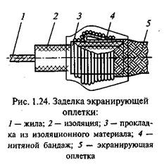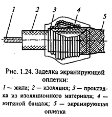 Существует и другой способ разделки проводов. В этом случае гибкий луженый провод навивают на экранирующую оплетку (пять-шесть витков) и облуживают припоем ПОС-61. При этом под экранирующую оплетку в месте пайки на изоляцию кабеля наматывают два-три слоя теплостойкой изоляционной ленты, на которую после намотки надвигают оплетку, а затем навивают на нее провод и производят пайку. Место пайки закрывают изоляционной трубкой. В этом случае, если конец экранирующей оплетки провода не подлежит заземлению (рис. 1.24), его освобождают от экрана, который подрезают на длину 10... 25 мм. Под экран подматывают изоляционный материал (например, ленту из шелковой лакоткани в два слоя), а сверху него накладывают нитяной бандаж, покрытый