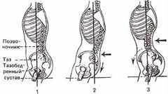 Обратное действие достигается, если позвоночник прогибается вперед, когда таз наклоняется вперед, а его кости отходят назад.