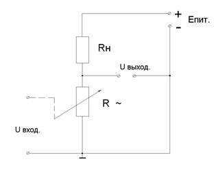 Последовательно с источником питания с напряжением Епит включены два сопротивления: постоянное сопротивление нагрузки RН и изменяемое сопротивление R~. Роль изменяемого сопротивления играет транзистор или лампа, которые под воздействием управляющего напряжения (в лампе или полевом транзисторе) или тока (в биполярном транзисторе), подводимого к входу усилителя, изменяют своё внутреннее сопротивление постоянному току. Изменение внутреннего сопротивления может осуществляться в очень широких пределах практически без затраты энергии или при очень малой её трате. В то же время мощность, выделяющаяся в нагрузке, может быть значительной. Чтобы выходное напряжение было похожим по форме на входное, требуется плавное изменение внутреннего сопротивления лампы или транзистора, т.е. необходим так называемый усилительный режим их работы.