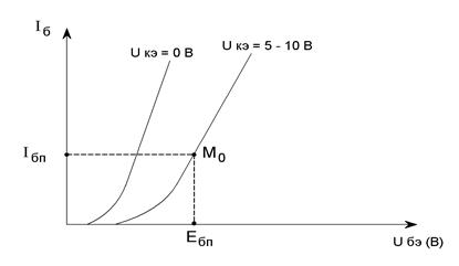 3. Выбрав на входной динамической характеристике точку, находящуюся приблизительно на середине относительно прямолинейного участка, можно определить, какой величине тока базы IБП соответствует точка покоя М0 и соответствующее этой величине напряжение смещения на базе ЕБП.