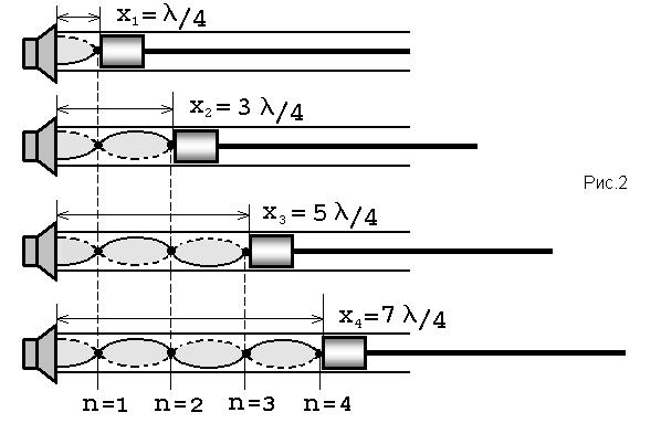 Отже, при значеннях xn, які задаються формулою (3) (звучання повітряного стовпа максимальне) між мембраною і поршнем вкладається непарна кількість чвертей довжин хвиль (див.рис.2).
