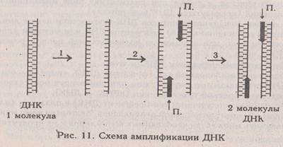 Более соверше-тным и быстрым методом идентификации генома человека является ПЦР-многократное копирование (амплификация) определенного фрагмента ДНК с помощью ДНК-полимеразы. При этом достаточно иметь 1-2 клетки, 1 молекулу ДНК, 1-2 гена или их фрагменты. Один цикл ПЦР слагается из 3-х стадий (рис. 11):