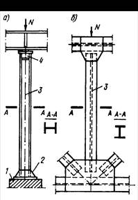 | а – колонна; б – сжатый стержень тяжелой фермы; 1 – фундамент; 2 – база; 3 – стержень; 4 – оголовок Рисунок 9.1 - Схемы стержней, работающих на центральное сжатие |