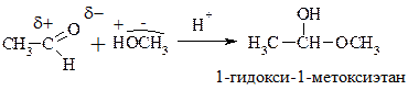 При избытке спирта образуется ацетали. Ацетали – это соединения, содержащие при одном атоме С две алкоксильных (–ОR) группы.