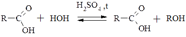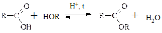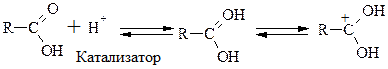 Механизм: d+ на атоме С карбоксильной гр. очень мал, спирт – слабый нуклеофил, поэтому р-цию ведут в присутствии неорганической к-ты: