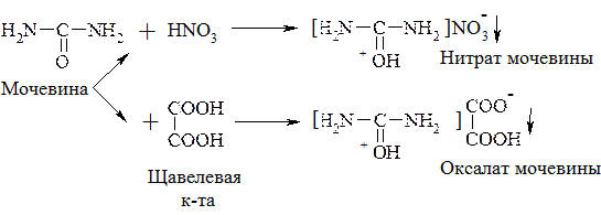 Оснóвным центром в мочевине считают атом О. Соли нитрат и оксалат мочевины – твердые вещ-ва, плохо растворимы в воде: