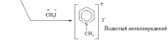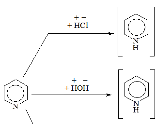 Атом азота имеет неподеленную электронную пару на гибридной орбитали, поэтому подобно аминам пиридин проявляет оснóвные св-ва, образуя соли с к-тами, и нуклеофильные св-ва, присоединяя другую положительную частицу: