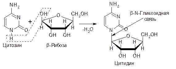 Пентозы, соединяясь с азотистыми основаниями, образуют нуклеозиды. Пуриновые основания присоединяются по 9, а пиримидиновые по 1 атому азота b-N- гликозидной связью. Схема образования пуринового нуклеозида: