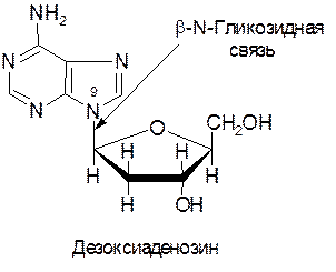 При названии пуриновых нуклеозидов окончание- ИН меняется на-ОЗИН: аденозин, гуанозин. Если в состав нуклеозида входит 2-дезоксирибоза, – перед названием нуклеозида ставится приставка ДЕЗОКСИ: