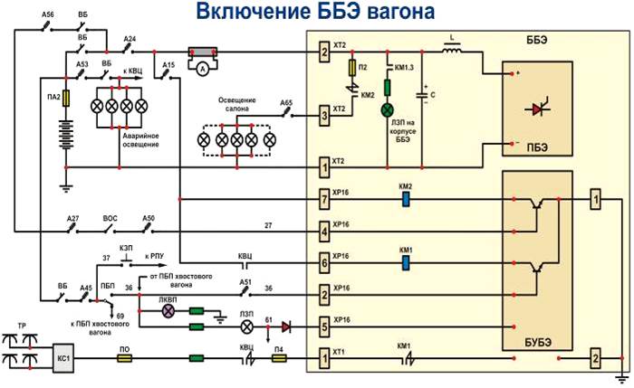 ББЭ обеспечивает напряжение 72-84В, ток подзаряда 20-30А, при срабатывании защиты через 27с. произойдёт самовосстановление ББЭ. Если в течение последующих 13с. защита сработает вновь, то на пульте загорится лЗП (защита преобразователя) (в схеме 36пр и 61пр), ББЭ больше не самовосстановится и на блоке под вагоном будет гореть зелёная лампа отказа.