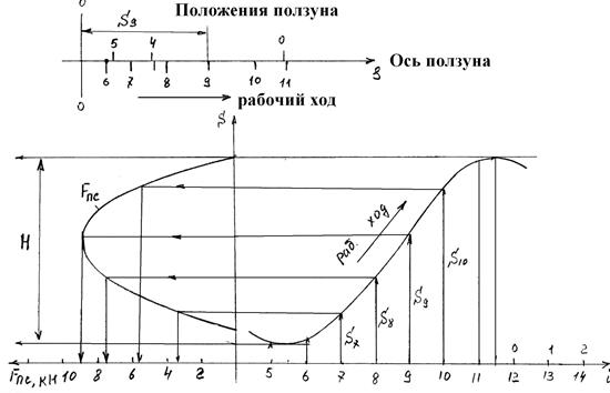 На оси ползуна отмечается условный ноль хода ползуна. В сторону рабочего хода в порядке возрастания номеров положений ползуна измеряется перемещение ползуна и откладывается на диаграмме для соответствующего номера. Далее строится график