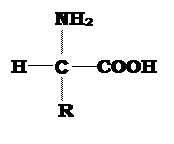 | Рис. 1 Структурная формула аминокислот. NH2 – аминогруппа; COOH – карбоксильная группа; (H – атом водорода); радикал R – боковая группа. |