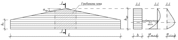 Рисунок 8.3 - Розподіл нормальних і радіальних напружень у перерізі 1-1, розташованому в гребені двосхилої балки