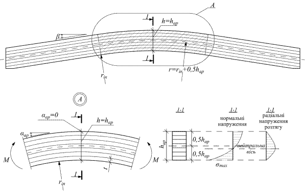 тут rin – внутрішній радіус криволінійної ділянки балки;