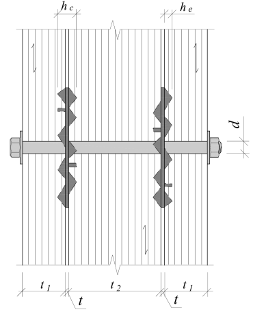 Для з'єднань з однією або декількома плоскостями зсуву, незалежно від типа використаного зв'язку, при визначенні несучої здатності з'єднання число зв'язків на одну плоскість зсуву приймається рівним числу стяжних болтів. Це застосовується у випадках, коли зв'язки навантажені вздовж або впоперек волокон.
