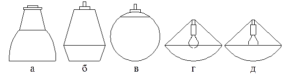 1) по распределению светового потока в пространстве – светильники прямого (а), преимущественно прямого (б), рассеянного (в), преимущественно отражённого (г) и отражённого света (д);