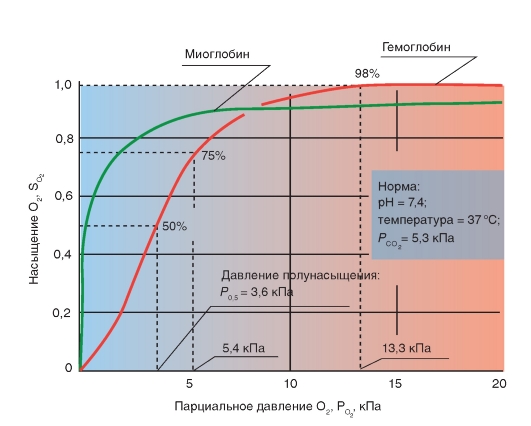 Кривая связывания О2 крови (оранжевая кривая). Показана зависимость между насыщением гемоглобина О2 (SO2 ) от РО2 , так что кривая отражает кислородную емкость крови при разных значениях РО2 . Кривая имеет S-образную форму и парциальное давление полунасыщения (Р0,5) в 3,6 кПа. Далее при увеличении значения РО2 насыщение гемоглобина кислородом увеличивается от 75 до 98%. Кривая действительна для приведенных значений, характерных для нормальной артериальной крови. Для сравнения приведена кривая связывания кислорода миоглобином, имеющая форму гиперболы (зеленая кривая). Как видно из нижнего участка зеленой кривой, одинаковой с артериальной кровью (оранжевая кривая), SO2 достигается при меньших значениях РО2 . Как видно из верхнего участка зеленой кривой, насыщение SO2 мало зависит от РО2
