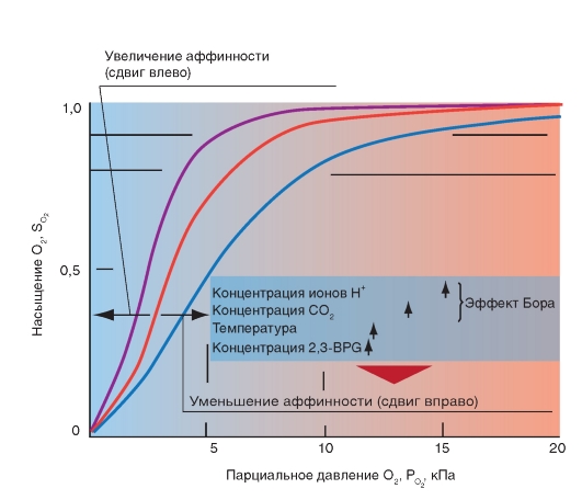 Уменьшение аффинности означает, что при одинаковом РО2 Hb способен связывать О2 в меньшей степени; кривая при этом сдвигается вправо. Причиной этого является повышение ряда факторов в эритроците (t°, рН, CO2 и т.п.). Уменьшение этих факторов влияет, наоборот, на повышение аффинности, т.е. сдвиг кривой влево