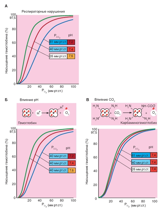 А - эффекты респираторных нарушений, связанные с изменением рСО2 и рН. Б - сдвиги сатурационной кривой при изменения рН, но при неизменном рСО2. В - сдвиги сатурационной кривой при изменения рCO2, но при неизменном рН