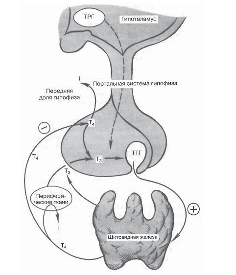 Қалқанша без қызметі гипофиз арқылы теріс кері байланыс қағидасы бойынша реттеледі. Гипофиздің тиреотропты гормоны (ТТГ) тиреоидты гормондардың өндірілуін ынталандырады, ал ол өз кезегінде ТТГ синтезін тежейді (3.4сурет).