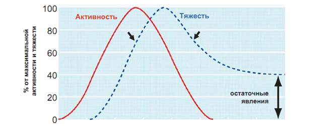 | 3.14 сурет Активность- Белсенділігі Тяжесть- Ауырлығы Остаточные явления- Қалдық белгілер % от максимальной активности и тяжести- Белсенділігі мен ауырлығының максимальды % |