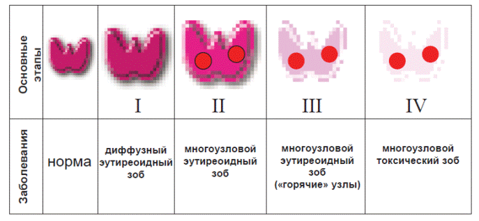 3.29 сурет. Қалқанша бездің функциональды автономиясының патогенезі (йод тапшылықты жемсау ағымының сатылары)