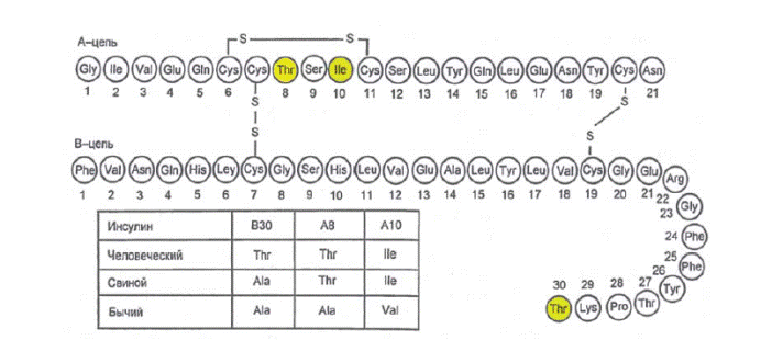 | 7.1 сурет Человеческий- Адам инсулині Свиной- Шошқа Бычий- Бұқа А-цепь- А-тізбек В-цепь- В-тізбек |