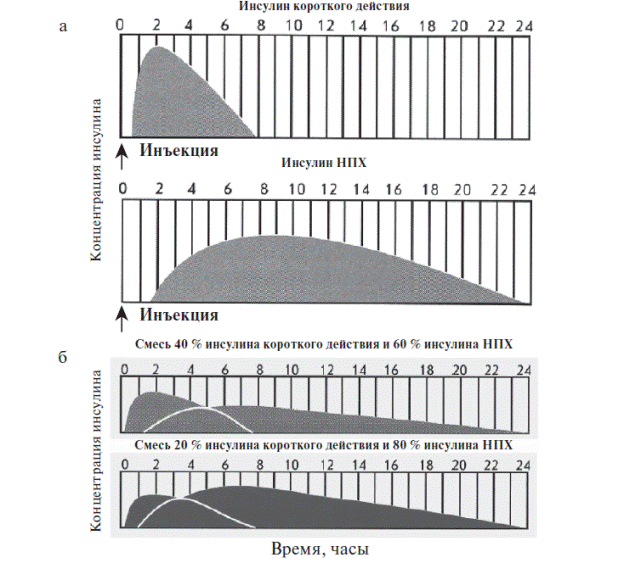 | 7.5 сурет Время, часы- Уақыт, сағаттар Концентрация инсулина- Инсулин концентрациясы Смесь 20% инсулина короткого действия и 80% инсулина НПХ- 20% қысқа әсерлі инсулин мен 80% НПХ инсулинінің қоспасы Смесь 40% инсулина короткого действия и 60% инсулина НПХ- 40% қысқа әсерлі инсулин мен 60% НПХ инсулинінің қоспасы Инъекция- Егу Инсулин НПХ- НПХ инсулині Инсулин короткого действия- Қысқа әсерлі инсулин |