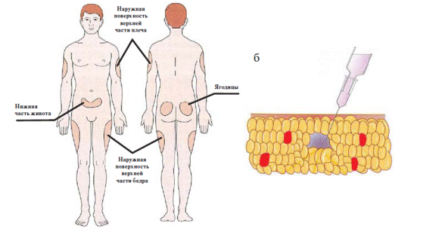 7.6 сурет.Инсулин екпесі: а) егудің типті орындары б) егу барысында инсулин шприці инесінің қалпы