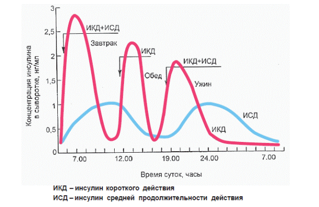 | 7.7 сурет ИКД-инсулин короткого действия- ҚӘИ-Қысқа әсерлі инсулин ИСД-инсулин средней продолжительности действия- ОӘИ-Орташа әсерлі инсулин Время суток, часы- Тәулік уақыты, сағаттар Концентрация инсулина в сыворотке, нг/мл- Сары судағы инсулин концентрациясы, нг/мл ИКД+ИСД- ҚӘИ+ОӘИ Завтрак- Таңғы ас ИКД- ҚӘИ Обед- Түскі ас ИКД+ИСД- ҚӘИ+ОӘИ Ужин- Кешкі ас |