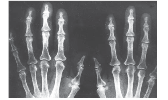 8.4 сурет.Біріншілік гиперпаратиреоз кезіндегі қол ұшының рентгенограммасы: саусақтардың субпериостальды резорбциясының белгілері