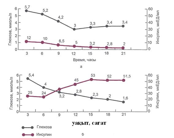 9.3 сурет.Үш күндік ашығу сынағы кезінде қандағы инсулин мен глюкоза деңгейі: А — қалыпты; Б — инсулиномамен ауыратын науқас