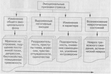 Эмоциональные проявления стресса в первую очередь касаются характеристик общего эмоционального фона, который приобретает негативный, мрачный, пессимистичный оттенок. При длительном стрессе человек становится более тревожным по сравнению с его нормальным состоянием, теряет веру в успех и в случае особо затяжного стресса может впасть в депрессию. На фоне такого измененного настроения у человека, испытывающего стресс, отмечаются более сильные эмоциональные вспышки, чаще всего — негативного характера. Это могут быть эмоциональные реакции раздражительности, гнева, агрессии, вплоть до аффективных состояний.