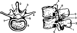 Рис. 7.1. Строение поясничного позвонка. Вид .сверху на поясничный позвонок (слева) и вид сбоку на два соседних поясничных позвонка (справа). 1 — пластинка дуги позвонка; 2 — остистый отросток; 3 — верхняя суставная поверхность; 4 — поперечный отросток; 5 — ножка; 6 — тело позвонка; 7 — позвоночный канал; 8 — межпозвонковое отверстие; 9 — нижняя суставная поверхность (заимствовано из: Levins D. В. In: Arthritis and Allied Conditions: A Textbook of Rheumatology. 10th ed./Ed. D. J. McCarty, Philadelphia, Lea and Febiger, 1985).