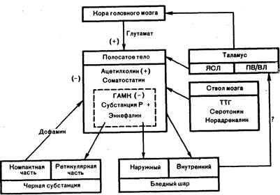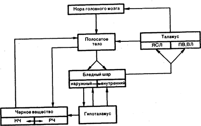 Аксоны некоторых корковых нейронов образуют внутреннюю капсулу (кортико-спинальный и кортико-бульбарный пути); они также проецируются в полосатое тело. Образуется завершенная петля — от коры головного мозга к полосатому телу, затем к бледному шару, к таламусу и вновь к коре головного мозга. Аксоны, выходящие из парацентрального ядра таламуса, отдают проекции назад, к полосатому телу, завершая, таким образом, петлю подкорковых ядер — от полосатого тела к бледному шару, затем к парацентральному ядру и вновь к полосатому телу. Существует еще одна петля базальных ядер между полосатым телом и черным веществом. Дофаминергические нейроны компактной части черного вещества проецируются в полосатое тело, а отдельные нейроны полосатого тела, выделяющие ГАМК и субстанцию Р, посылают проекции в ретикулярную часть черного вещества. Существует реципрокная связь между ретикулярной и компактной частями черного вещества; ретикулярная часть посылает проекции к вентральному отделу зрительного бугра, верхнему бугорку, а также к ретикулярной формации ствола мозга. Субталамическое ядро получает проекции из образований новой коры и из латерального сегмента бледного шара; нейроны внутри субталамического ядра образуют реципрокные связи с латеральным сегментом бледного шара, а также посылают аксоны к медиальному сегменту бледного шара и ретикулярной части черного вещества. Нейрохимические агенты, участвующие в этих процессах, остаются неизвестными, хотя выявлено участие ГАМК.