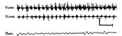 Рис. 15,7. Тремор действия у больного с эссенциальным тремором. Запись произведена с мышц правой руки во время сгибания кисти назад; в остальном записи сходны с таковыми на рис. 15.4. Калибровка 500 мс. Необходимо отметить, что во время тремора действия разряды биоэлектрической активности на ЭМГ с частотой примерно 8 Гц возникали синхронно в мышцах-антагонистах.