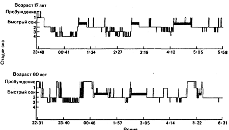 Рис. 20.1. Схемы четырех стадий медленного сна и быстрого сна (непрерывная полоса) в течение всего ночного сна у человека молодого (вверху) и пожилого (внизу) возраста. В пожилом возрасте отмечаются подавление дельта-сна и частые спонтанные пробуждения. Схемы получены из Центра по изучению расстройств сна и бодрствования, Массачусетскнй центральный госпиталь.