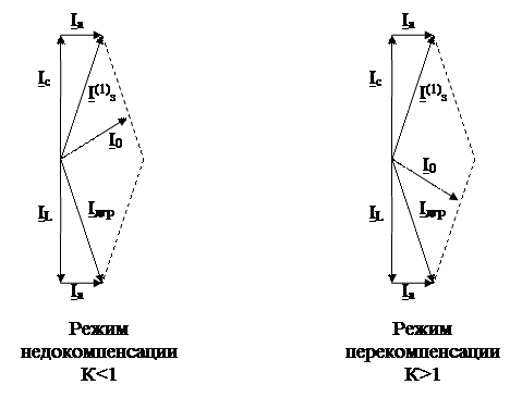 В режиме недокомпенсации индуктивная составляющая тока в месте замыкания на землю больше, чем емкостная составляющая этого тока. Величина остаточного тока довольно велика, дуга может не погаснуть при прохождении тока через нулевое значение. Также довольно большим может оказаться ток и при перекомпенсации – случае, когда индуктивная составляющая тока в месте замыкания на землю меньше, чем емкостная составляющая этого тока.