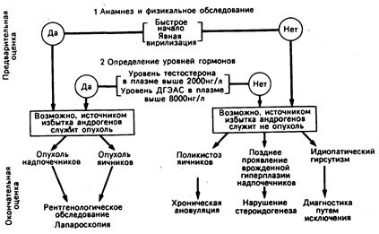 Диагностика. Решение о времени начала комплексного диагностического обследования зависит от нескольких факторов. Его целесообразно проводить у всех женщин с гирсутизмом и признаками вирилизации. При изолированном гирсутизме объем обследования зависит от выраженности, распределения и скорости роста волос. Подходы к обследованию представлены на рис. 46-1. При сборе анамнеза особое внимание обращают на прием медикаментозных средств, подробности полового созревания и особенности менструальной функции, а.также на их связь с избыточным ростом волос. Физикальное обследование предусматривает осмотр участков роста андрогензависимого волосяного покрова: лобка, подмышечных впадин, лица, туловища, рук и ног, а также выявление признаков вирилизации, коррелирующих с избыточной продукцией андрогенов. Это в свою очередь повышает вероятность андрогенпродуцирующей опухоли. К этим признакам относят расширение гортани (пропорционально громкости голосов), облысение в височной области, клиторомегалию, увеличение мышечной массы плечевого пояса и на ногах. Следует постараться выявить признаки избытка кортизола (плетора, ожирение по центральному типу, стрии, жировые складки в области шеи и надключичной области). При обследовании органов малого таза следует обращать внимание на объемные образования, связанные с яичниками. Назначаемые в этих случаях лабораторные исследования включают в себя определение уровня андрогенов в сыворотке и при необходимости рентгенографию яичников и надпочечников. Уровень дегидроэпиандростерона сульфата, превышающий 8000 нг/л, или тестостерона более 2000 нг/л позволяет заподозрить неопластический источник избыточной продукции андрогенов. Нормальный уровень тестостерона в плазме труднее поддается интерпретации, поскольку у женщин его общий уровень необязательно коррелирует с количеством его свободной или связанной фракции при состояниях, при которых уровнь тестостеронсвязывающего глобулина повышен или снижен. При подозрении на синдром Кушинга, о котором могут свидетельствовать результаты какого-либо скринирующего теста (например, экскреция свободного кортизола с мочой или тест с ночным приемом дексаметазона), следует проводить обычное исследование с использованием дексаметазона. Поликистоз яичников диагностируют на основании данных анамнеза и клинического обследования женщин с хронической ановуляцией. Женщин с выраженным гирсутизмом, сочетающимся с кистозным воспалением сальных желез, можно попытаться обследовать на предмет выявления поздней гиперплазии, применяя тест с кратковременной стимуляцией косинтропином и измерением уровня 17-гидроксипрогестерона в плазме.