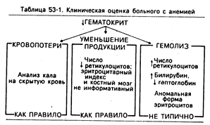 Оценка клинического статуса больного с анемией должна быть основана па четких патофизиологических критериях. Как можно видеть из табл. 53-1, клиницист в первую очередь должен получить ответ на вопрос, обусловлена ли анемия снижением продукции эритроцитов или их усиленным разрушением. Более того, следует обсудить возможность кровопотерь с точки зрения исключительно этиологии анемии либо как способствующего фактора. Анализ кала на скрытую кровь также относится к обязательной части обследования больного с анемией. На этом перепутье, т. е. на этапе еще не установленного диагноза, лабораторные данные приобретают особое значение: от них зависит решение вопроса о недостаточной продукции эритроцитов или об активном процессе гемолиза.