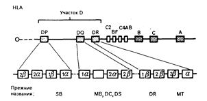 Показана локализация зоны HLA в регионе 21 короткого плеча. Локусы HLA-A, HLA-B и HLA-C кодируют тяжелые цепи класса I (44000), тогда как 2-микроглобулиновая легкая цепь (11500) молекул класса I кодируется геном хромосомы 15. Зона HLA-D (класс II) расположена центромерно по отношению к локусам А, В и С с тесно сцепленными генами компонентов комплемента С4А, С4В, Bf и С2 на участке B-D. Порядок расположения генов комплемента не установлен. Каждая молекула класса II D-региона образована - и -цепями. Они присутствуют на клеточной поверхности в разных участках (DP, DQ и DR). Цифра, предшествующая знакам a и b, означает, что существуют различные гены для цепей данного типа, например, для DR существует три гена -цепей, так что экспрессируемые молекулы могут быть 1, 2 или 3. Антигены DRw52(MT2) и DRw53(MT3) находятся на 2-цепи, тогда как DR — на l-цепи. DR неполиморфен, а молекулы DQ-антигенов полиморфны как по -, так и по -цепям (22). Другие типы DQ (11) имеют ограниченный полиморфизм. Полиморфизм DP связан с -цепями. Общая протяженность HLA-региона— около 3 сМ.