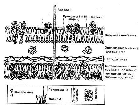 Рис. 104-1. Схематическое изображение оболочки гонококка, в которой представлены структуры, влияющие, как полагают, на патогенетические и антигенные свойства, чувствительность к противобактериальпым препаратам.