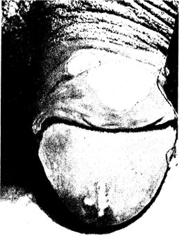 Болезнь начинается с появления папулы, которая затем изъязвляется и превращается в безболезненную несколько приподнятую над окружающими тканями очищенную зону рыхлой грануляционной ткани мясисто-красного цвета. Края язвы имеют неправильную форму; рост язвы осуществляется per continuitatem, часто в результате аутоинфекции в процесс вовлекаются прилежащие участки кожных покровов. Присоединяющаяся вторичная анаэробная инфекция вызывает болезненные ощущения и выделение зловонного экссудата. Реже наблюдаются осложнения в виде глубоких изъязвлений, хронического рубцевания очагов, фимоза, лимфатического отека, избыточной пролиферации эпителия, напоминающей карциному. У мужчин очаги поражения обычно локализуются на головке или теле (рис. Ill-la) полового члена, на крайней плоти или в перианальной области, тогда как для женщин наиболее характерно поражение половых губ. У женщин очаг поражения часто возникает в районе заднего соединения половых губ (уздечки) и затем прогрессирует в переднем направлении вдоль половой щели. Вторичные очаги поражения могут обнаруживаться на лице, шее, в ротовой полости, на других участках тела. Хроническое течение заболевания имеет важное диагностическое значение, так как часто проходит несколько месяцев, прежде чем больной получает лечение. Распространение процесса на паховую область при самозаражении, по продолжению или по лимфатическим путям, приводит к возникновению внутрикожных и подкожных очагов припухлости или нагноения, известных как «псевдобубоны», так как вовлечение в процесс прилежащих лимфатических узлов обычно бывает минимальным. Локальные деструктивные поражения или вторичная инфекция могут вызвать тяжелое заболевание или смерть. Описаны фатальные диссеминированные формы донованоза с вовлечением в патологический процесс костей, суставов или печени, развившиеся в результате длительной (иногда многолетней) хронической локальной инфекции. Взаимоотношения между донованозом и последующим развитием карциномы гениталий точно не установлено.